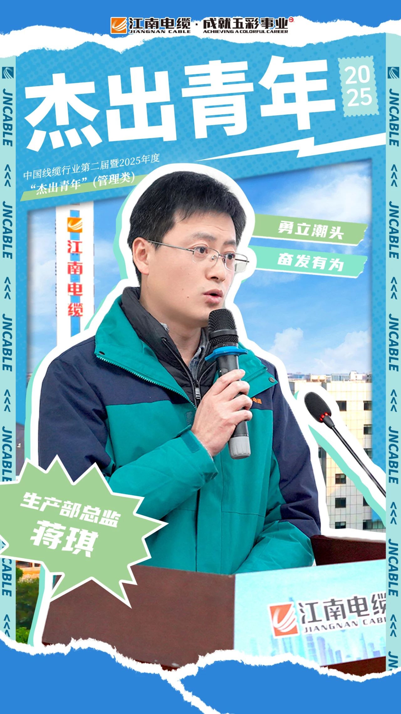 5月4日,中國線纜行業(yè)第二屆暨2025年度“杰出青年”評選結(jié)果正式揭曉。江南電纜生產(chǎn)部總監(jiān)蔣琪榮獲管理類“杰出青年”!