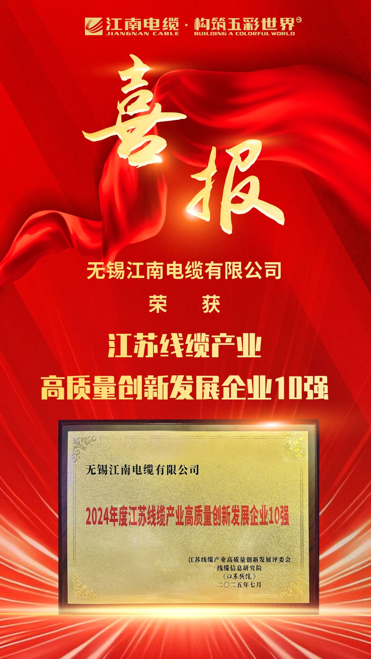7月25日,江蘇省線纜行業(yè)高質(zhì)量發(fā)展峰會在南通隆重召開,會議發(fā)布了“江蘇線纜產(chǎn)業(yè)高質(zhì)量創(chuàng)新發(fā)展企業(yè)10強(qiáng)”、江蘇省電線電纜行業(yè)2024年度“科技尖兵/杰出工匠/優(yōu)秀經(jīng)理”等榜單。
